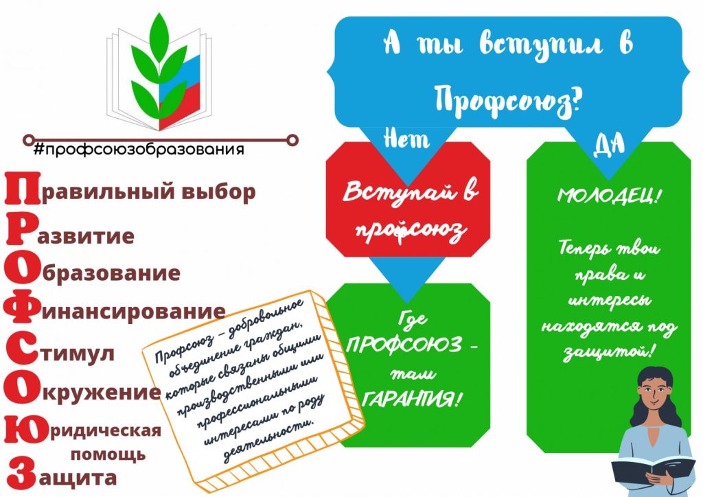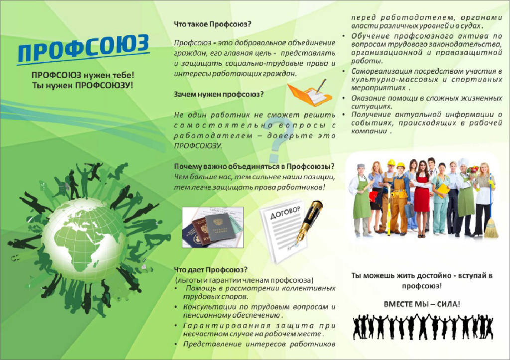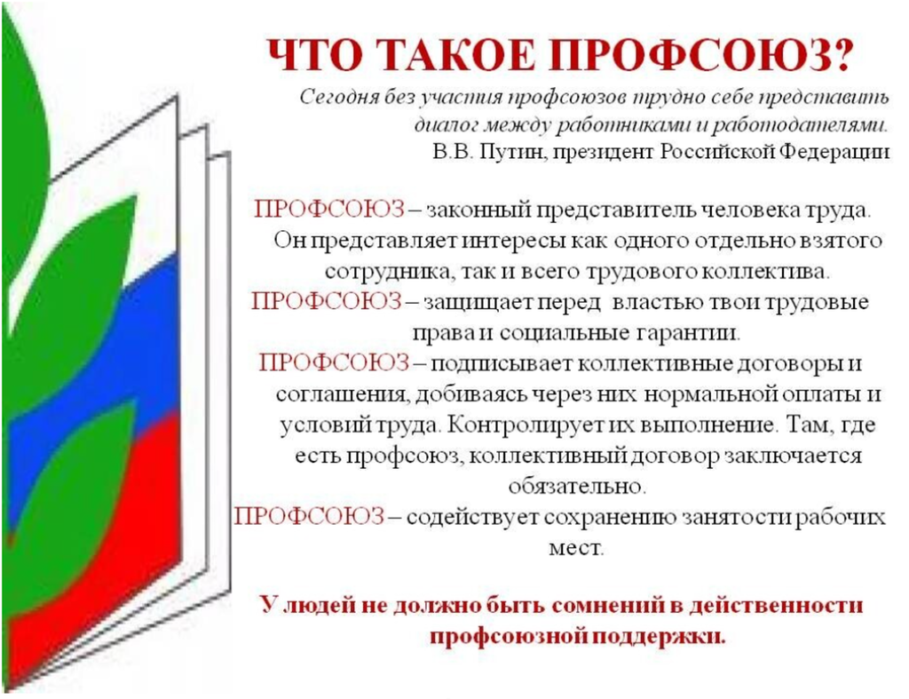• Есть профсоюзная организация — есть возможность защиты социальных гарантий в реализации права на труд. Есть профсоюзная организация — есть возможность получить помощь и поддержку коллег.